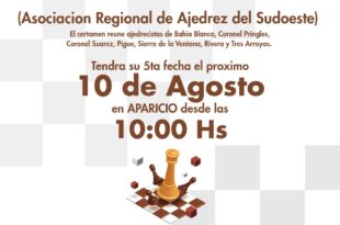 El venidero domingo 10 se llevará a cabo la 5ta fecha del torneo organizado por la Asociación Regional de Ajedrez del Sudoeste (ARASO) en Aparicio a partir de las 10. Participarán representantes de Bahía Blanca, Pigüé, Coronel Pringles, Sierra de la Ventana, Rivera, Coronel Suárez, Tres Arroyos y Coronel …