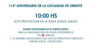 Este viernes 10 se realizará el Acto Protocolar por el 114º Aniversario de Oriente. Será desde las 10 en la Plaza Juan B. Maciel. Posteriormente en inmediaciones del Puente Nuevo, se inaugurará el Punto Fotográfico «Yo amo Oriente» y el Sendero Autoguiado que une los atractivos turísticos Puente Nuevo …