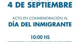 La Municipalidad anunció para el 4 de septiembre próximo el Acto en conmemoración al Día del Inmigrante. Será a las 10 en el Monumento a los Inmigrantes, en Maciel y Ramos Ojeda. Desde Protocolo se invitó a concurrir con banderas de ceremonia. Info e imagen : Prensa municipalidad de …
