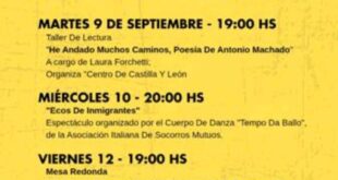 Cultura anunció la celebración de la Semana del Inmigrante en el Centro Cultural. Para hoy martes 9 a las 19, Taller de Lectura «He andado muchos caminos», poesía de Antonio Machado, a cargo de Laura Forchetti. Organiza el Centro de Castilla y León. Mañana miércoles 10 a las …