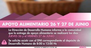 Desarrollo Humano de la comuna informó que la entrega de apoyo alimentario se realizará jueves 26 y viernes 27 de junio. Solicitó asistir con DNI al depósito del área de 8 a 13. Info e imagen : Prensa municipalidad de C.Dorrego