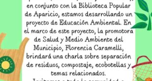 Este miércoles 25 a las 9 en el CEPT 35 de Aparicio, la promotora de Salud y Medio Ambiente de la comuna Florencia Caramelli brindará una charla abierta a la comunidad sobre separación de residuos, compostaje, ecobotellas, entre otros temas relacionados. Será como parte de «una comunidad, muchas voces, …