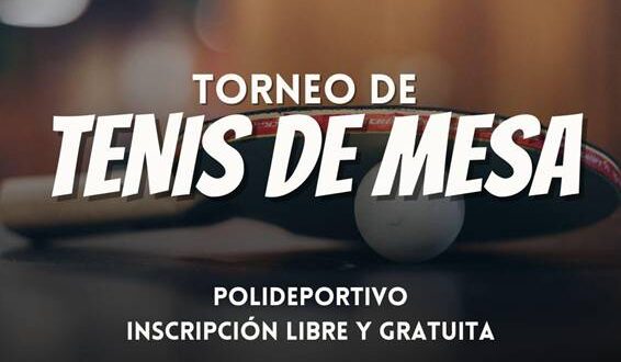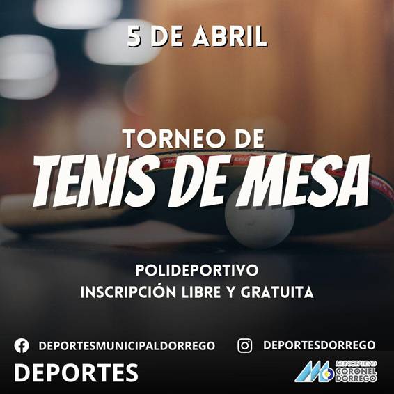 El venidero 5 de Abril en el Polideportivo Municipal desde las 15 se realizará un Torneo de Tenis Mesa. Las inscripciones, sin costo, se realizarán en el momento.