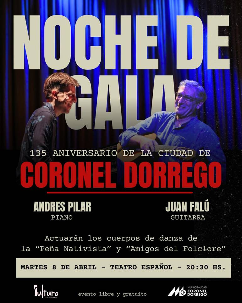 La Dirección de Cultura anunció una Noche de Gala por el 135 Aniversario de la ciudad. Será el 8 de Abril desde las 20:30 en el Teatro Español. Actuarán el guitarrista Juan Falú y el pianista Andrés Pilar. Se presentarán también los cuerpos de danzas de la Peña Nativista y la Agrupación Amigos del Folklore. El espectáculo será con entrada libre y gratuita.