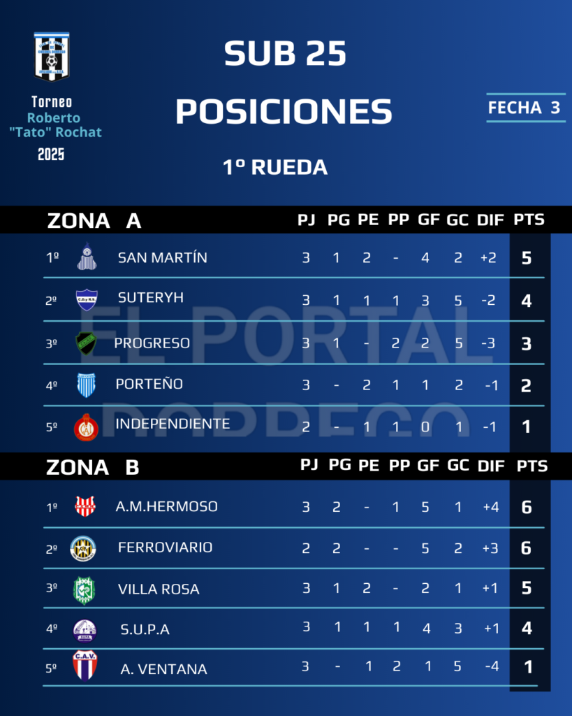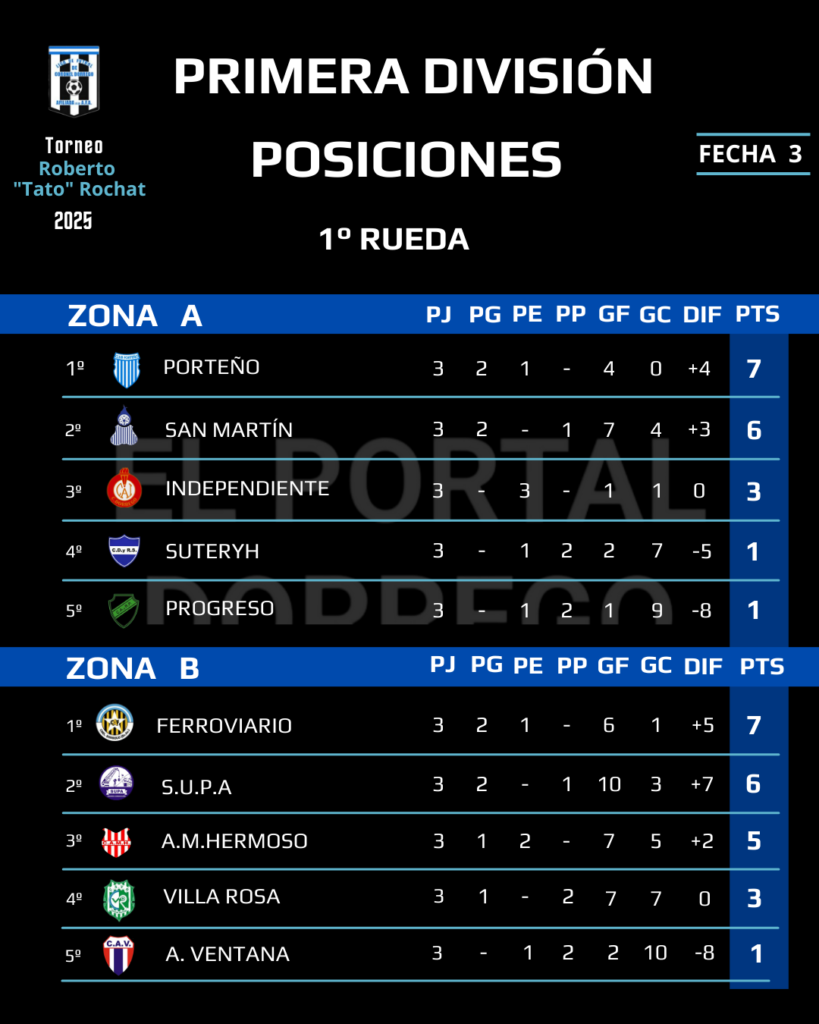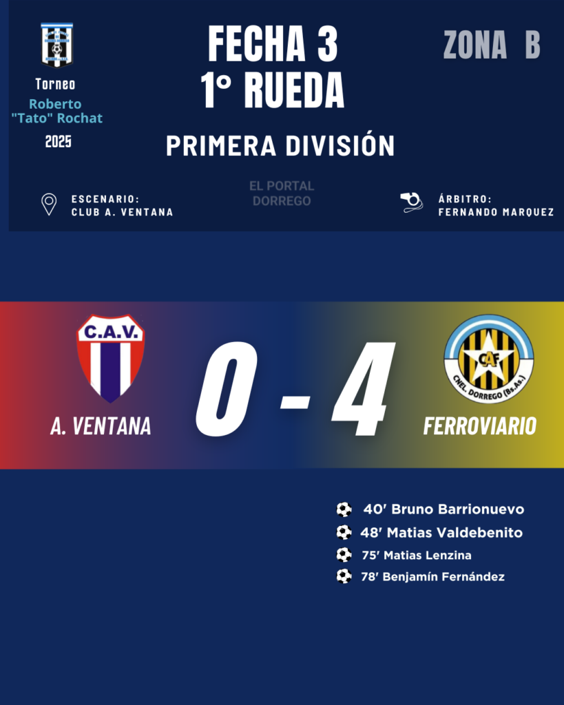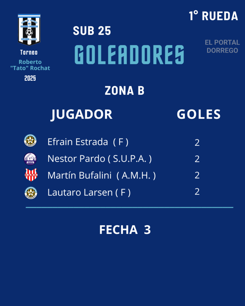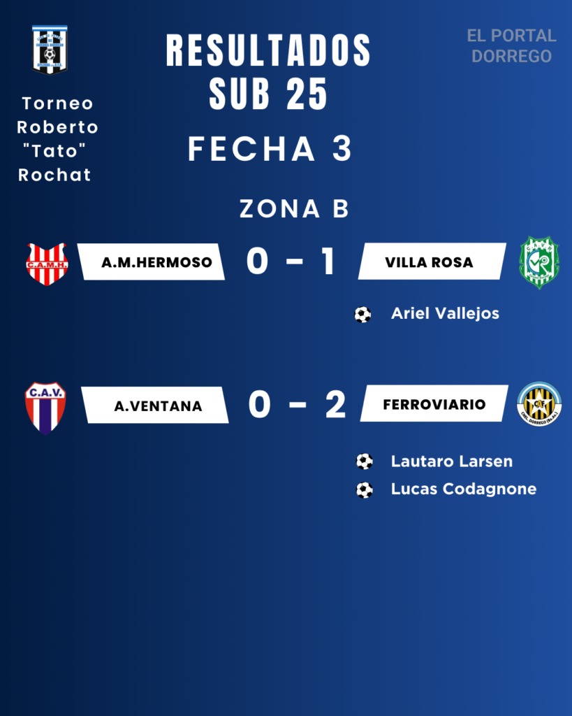Este miércoles con los encuentros de sub 25 y primera división entre Atlético Ventana y Ferroviario, se completó la fecha 3 de la primera rueda de la zona B del torneo Roberto «Tato» Rochat que organiza la Liga de fútbol de C.Dorrego
