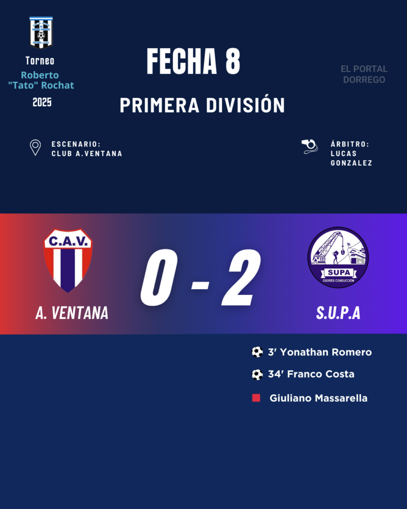 | A.Ventana : ( 1 ) : Matias Moreira S.U.P.A. : ( 1 ) : Alejo Derromeriz Expulsado : un jugador de S.U.P.A. |