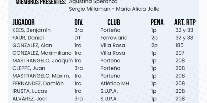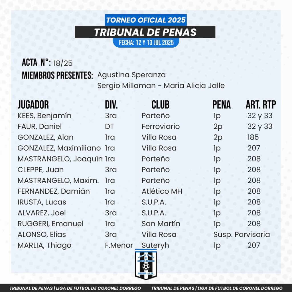 Fútbol local : Dictamen del Tribunal de Penas El portaldorrego julio 18, 2025 DEPORTES Comentarios desactivados en Fútbol local : Dictamen del Tribunal de Penas COMPARTIR tweetRelated Articles Fútbol menor : se completó la fecha 2 de la tercera rueda1 día ago Deportes. Torneo de Tejo en el Vivero Municipal2 días ago ACTIVIDAD DE FÚTBOL MENOR DEL PRÓXIMO SÁBADO3 días agoCOMPARTA NUESTRAS NOTICIAS COMPARTIR tweet