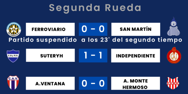 | A.M. Hermoso 5 Pts. U.Santamarina. 4 Pts. Independiente 4 Pts. Suteryh 4 Pts. Villa Rosa 1 Pt. San Martín 1 Pt. A.Ventana 1 Pt. Ferroviario 0 Pt. Ferroviario y San Martín tienen un partido suspendido cuando están 0 a 0 |