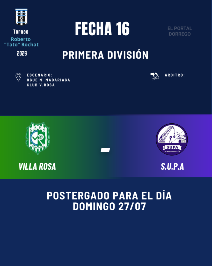 | Villa Rosa vs S.U.P.A. postergado para el día Domingo 27/07/25 |