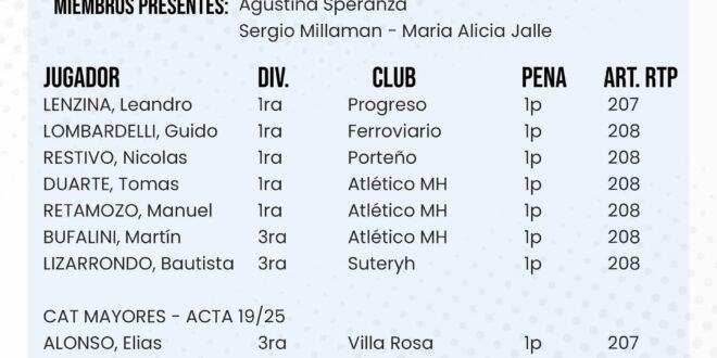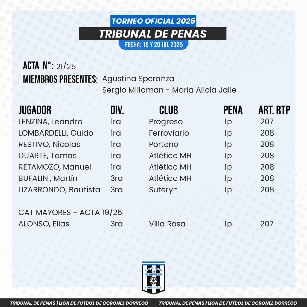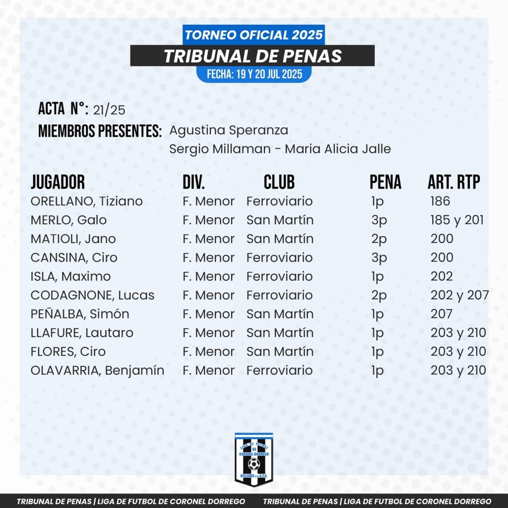 Fútbol local : Dictamen del Tribunal de Penas El portaldorrego julio 23, 2025 DEPORTES Comentarios desactivados en Fútbol local : Dictamen del Tribunal de Penas COMPARTIR tweetRelated Articles Fútbol menor : se completó la fecha 2 de la tercera rueda1 día ago Deportes. Torneo de Tejo en el Vivero Municipal2 días ago ACTIVIDAD DE FÚTBOL MENOR DEL PRÓXIMO SÁBADO3 días agoCOMPARTA NUESTRAS NOTICIASInfo : facebook Liga de fútbol Coronel Dorrego COMPARTIR tweet