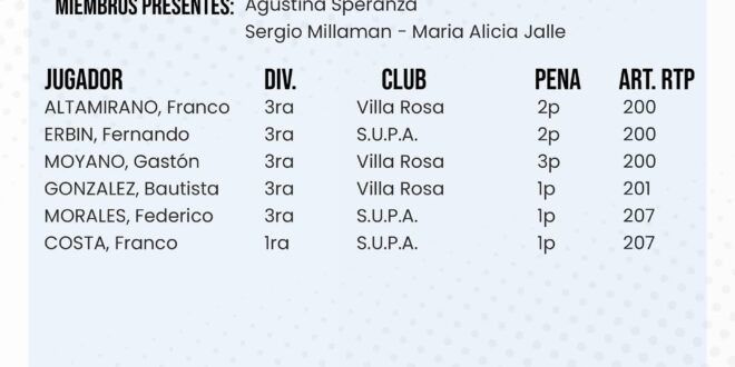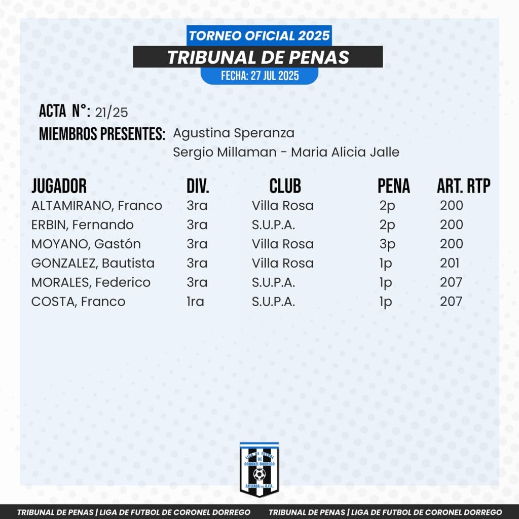 Fútbol local : Dictamen del Tribunal de Penas El portaldorrego julio 31, 2025 DEPORTES Comentarios desactivados en Fútbol local : Dictamen del Tribunal de Penas COMPARTIR tweetRelated Articles Fútbol menor : se completó la fecha 2 de la tercera rueda1 día ago Deportes. Torneo de Tejo en el Vivero Municipal2 días ago ACTIVIDAD DE FÚTBOL MENOR DEL PRÓXIMO SÁBADO3 días agoCOMPARTA NUESTRAS NOTICIASInfo : facebook Liga de fútbol Coronel Dorrego COMPARTIR tweet