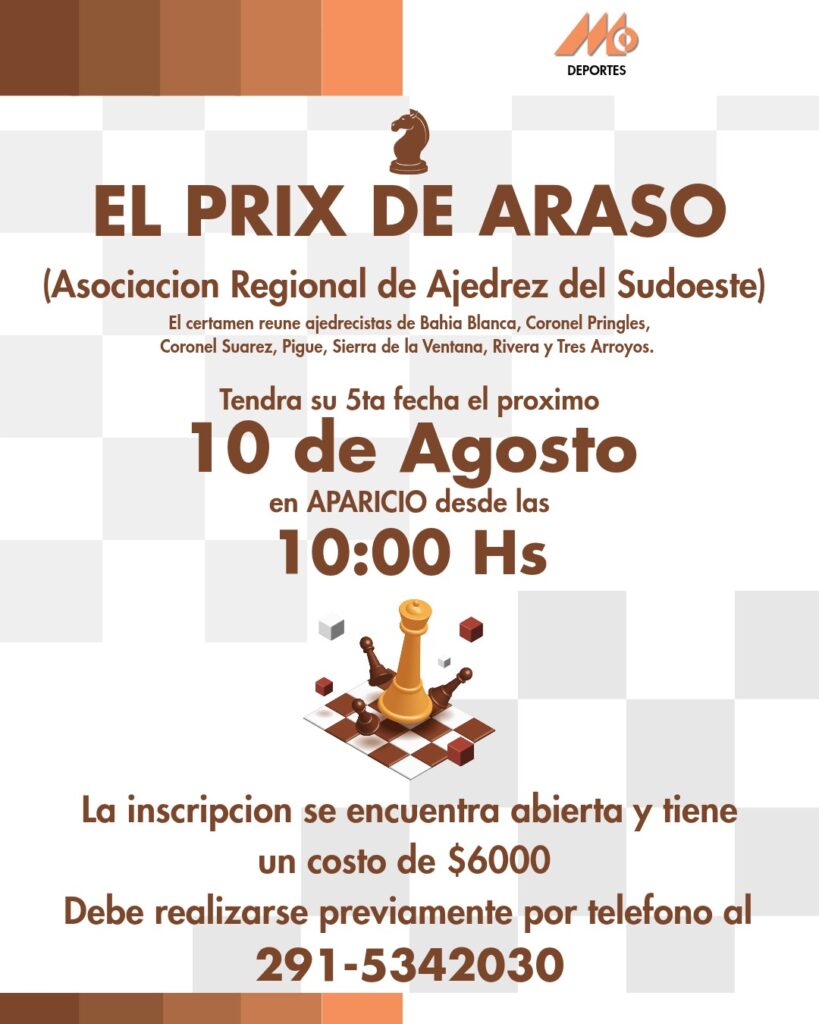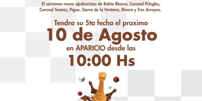 El venidero domingo 10 se llevará a cabo la 5ta fecha del torneo organizado por la Asociación Regional de Ajedrez del Sudoeste (ARASO) en Aparicio a partir de las 10. Participarán representantes de Bahía Blanca, Pigüé, Coronel Pringles, Sierra de la Ventana, Rivera, Coronel Suárez, Tres Arroyos y Coronel Dorrego.