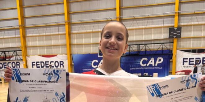 Deportes de la comuna informó que la patinadora local Tania De Marco alcanzó importantes logros ya que obtuvo la clasificación al Torneo Absoluto de Patín Artístico que se realizará en San Juan – al cual asisten las 10 mejores ranqueadas del país – en las 3 disciplinas individuales en que participó entre 27 patinadoras de su categoría.