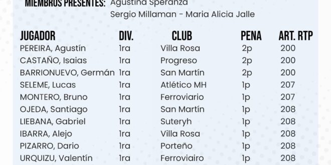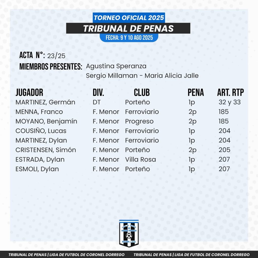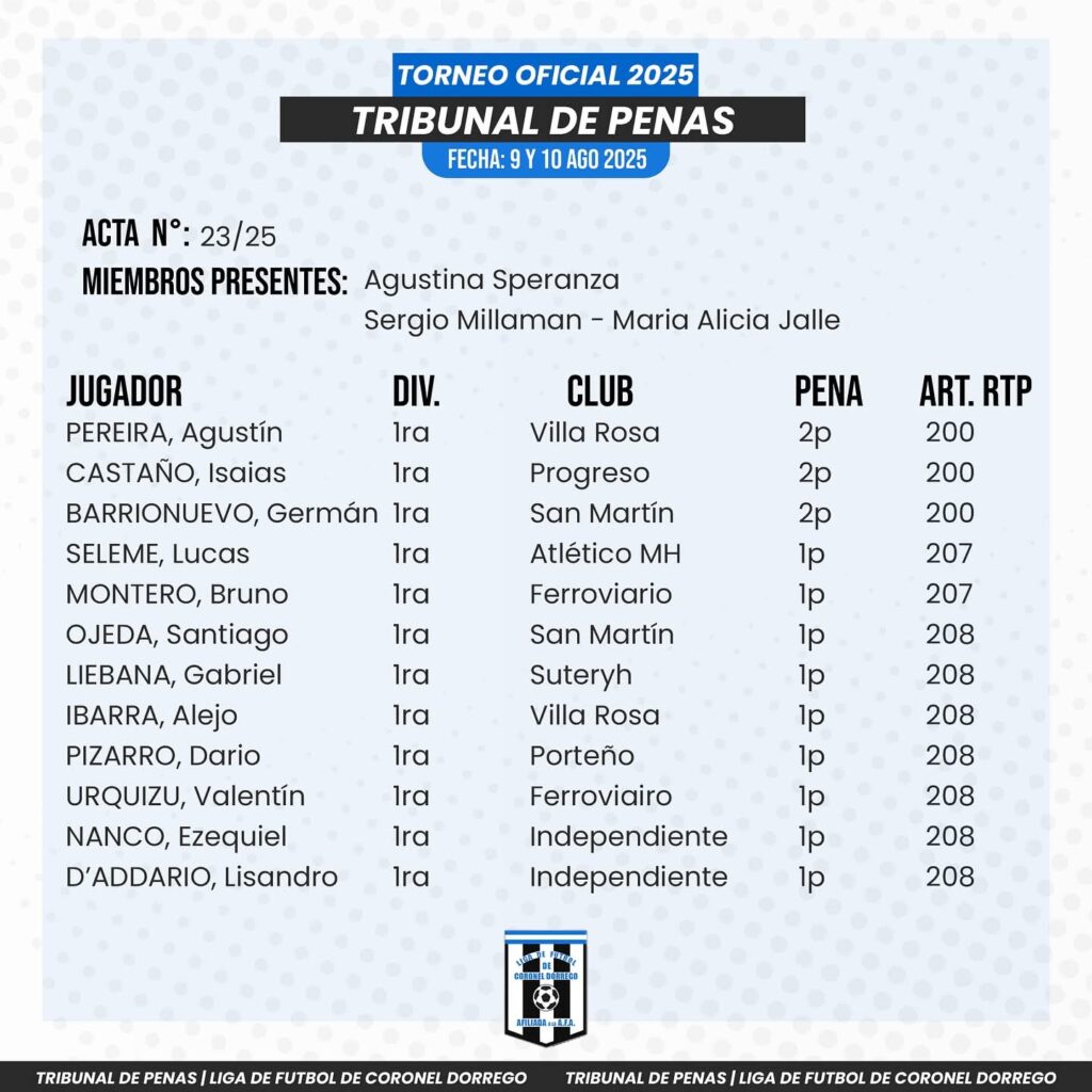 Fútbol local : Dictamen del Tribunal de Penas El portaldorrego agosto 13, 2025 DEPORTES Comentarios desactivados en Fútbol local : Dictamen del Tribunal de Penas COMPARTIR tweetRelated Articles Fútbol menor : se completó la fecha 2 de la tercera rueda1 día ago Deportes. Torneo de Tejo en el Vivero Municipal2 días ago ACTIVIDAD DE FÚTBOL MENOR DEL PRÓXIMO SÁBADO3 días agoCOMPARTA NUESTRAS NOTICIASInfo : facebook Liga de fútbol Coronel Dorrego COMPARTIR tweet
