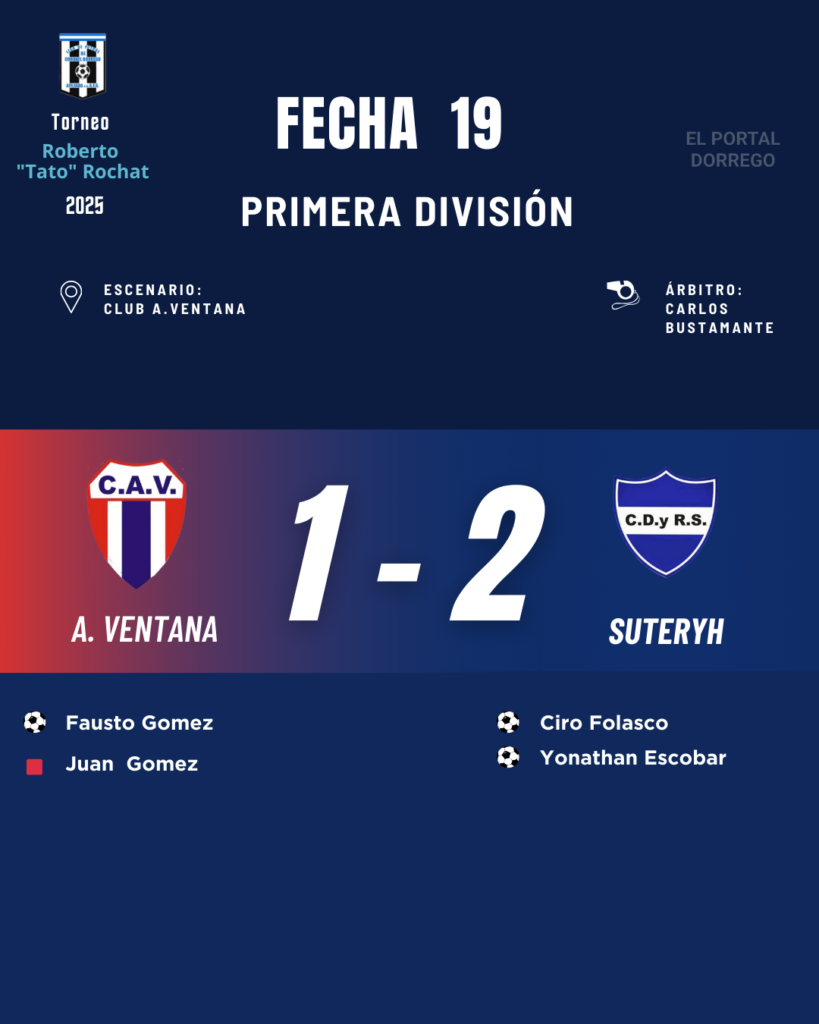 | A.Ventana : ( 0 ) Suteryh : ( 3 ) : Gustavo Miller – Jeremias Lizarrondo – Nicolas Troche Expulsado : Tobias Rodriguez ( A.V. ) |