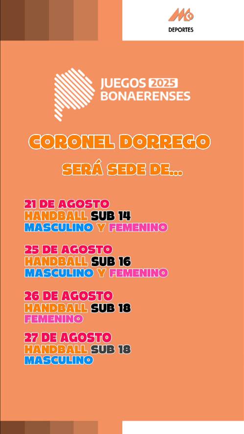 Deportes de la comuna informó que Coronel Dorrego será sede de la Etapa Regional de los Juegos Bonaerenses 2025 en la disciplina Handball en todas sus categorías, femeninas y masculinas. Según explicó Rubén Bilbao, director de Deportes de la comuna, recibirán en el Polideportivo a equipos representantes de los municipios de Benito Juárez, Laprida, Coronel Pringles, San Cayetano, Gonzáles Chaves y Tres Arroyos.