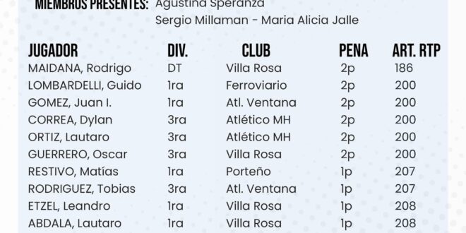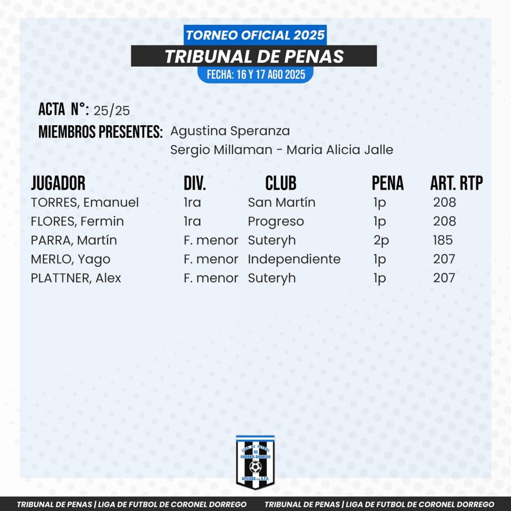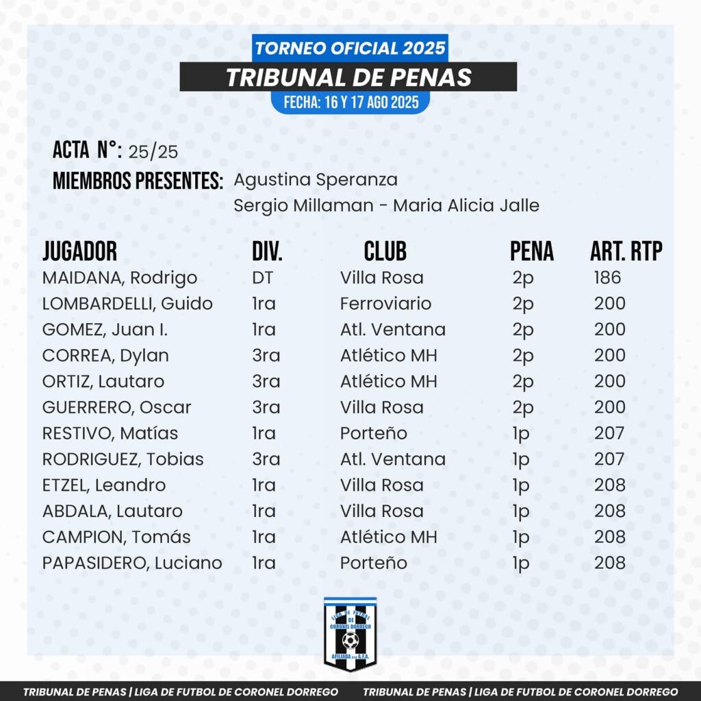 Fútbol local : Dictamen del Tribunal de Penas El portaldorrego agosto 21, 2025 DEPORTES Comentarios desactivados en Fútbol local : Dictamen del Tribunal de Penas COMPARTIR tweetRelated Articles Fútbol menor : se completó la fecha 2 de la tercera rueda1 día ago Deportes. Torneo de Tejo en el Vivero Municipal2 días ago ACTIVIDAD DE FÚTBOL MENOR DEL PRÓXIMO SÁBADO3 días agoCOMPARTA NUESTRAS NOTICIASInfo : Liga de Fútbol Coronel Dorrego COMPARTIR tweet