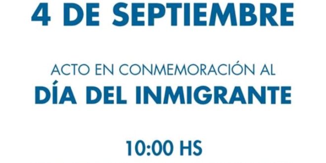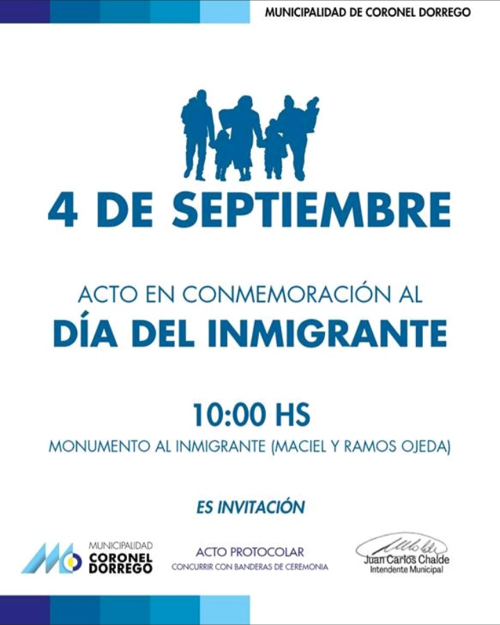 La Municipalidad anunció para el 4 de septiembre próximo el Acto en conmemoración al Día del Inmigrante. Será a las 10 en el Monumento a los Inmigrantes, en Maciel y Ramos Ojeda. Desde Protocolo se invitó a concurrir con banderas de ceremonia.