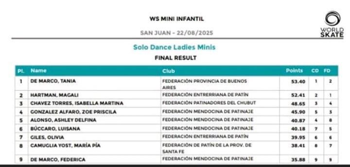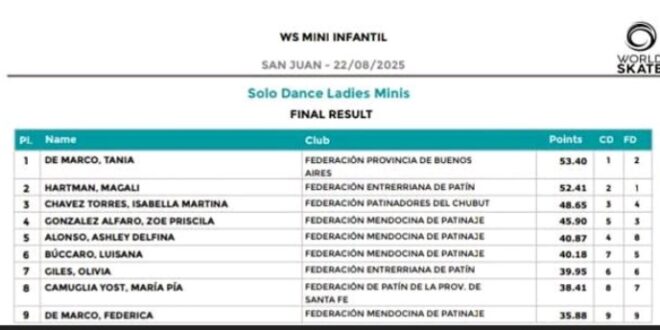 Deportes de la comuna informó que la patinadora local, Tania De Marco obtuvo el primer puesto, representando a la Federación de la Provincia de Buenos Aires en el Torneo Absoluto disputado en San Juan, en la categoría Solo Dance, Mini Infantil