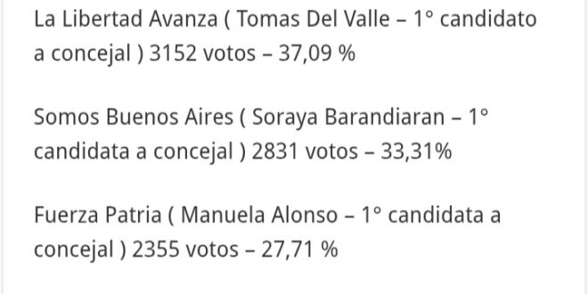 | Somos Buenos Aires ( Soraya Barandiaran – 1° candidata a concejal ) 355 votos – 34,49% Fuerza Patria ( Manuela Alonso – 1° candidata a concejal ) 354 votos – 34,40 % La Libertad Avanza ( Tomas Del Valle – 1° candidato a concejal ) 286 votos – 27,79 % Unión y Libertad ( Fernanda Gutierrez – 1° candidata a concejal ) 34 votos – 3, 30 % |