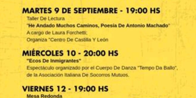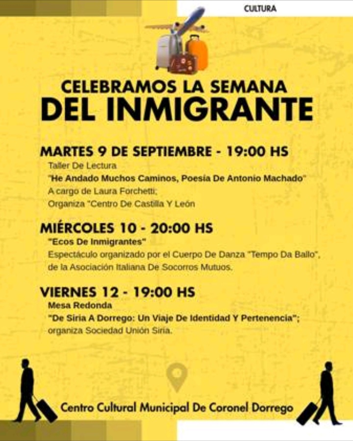 Cultura anunció la celebración de la Semana del Inmigrante en el Centro Cultural. Para hoy martes 9 a las 19, Taller de Lectura «He andado muchos caminos», poesía de Antonio Machado, a cargo de Laura Forchetti. Organiza el Centro de Castilla y León.