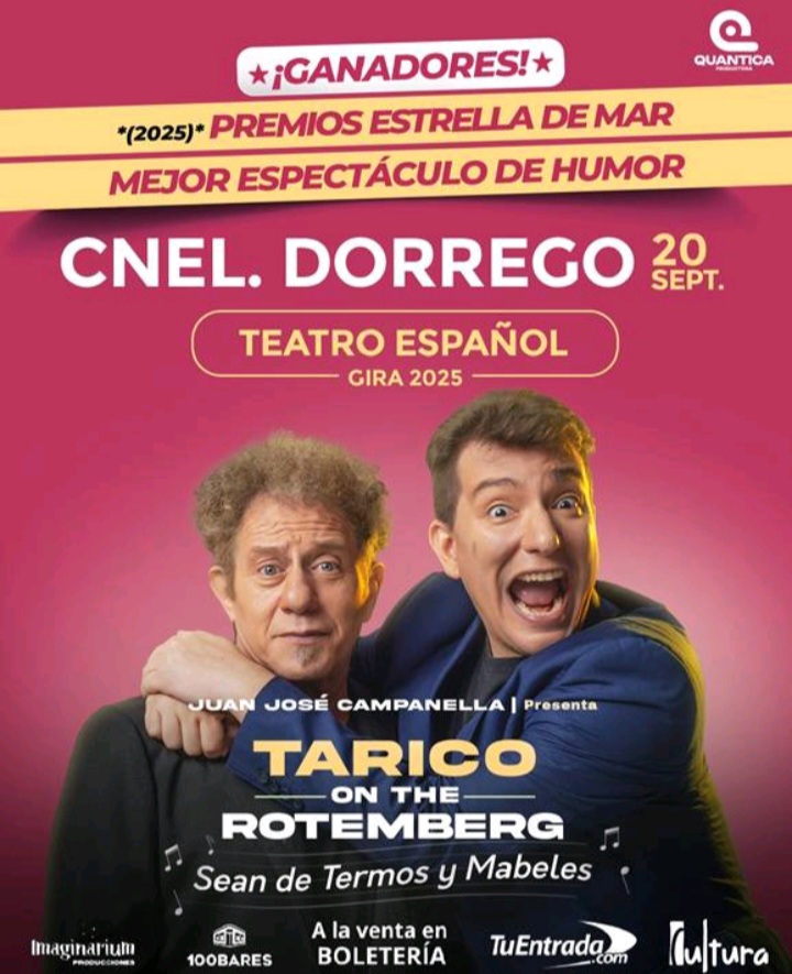 Cultura anunció que se presentará en Coronel Dorrego el espectáculo teatral Sean de Termos y Mabeles, Tarico on the Rotemberg. Será este sábado 20 en el Teatro Español. Las entradas están en venta en el Centro Cultural o por internet en TuEntrada.com