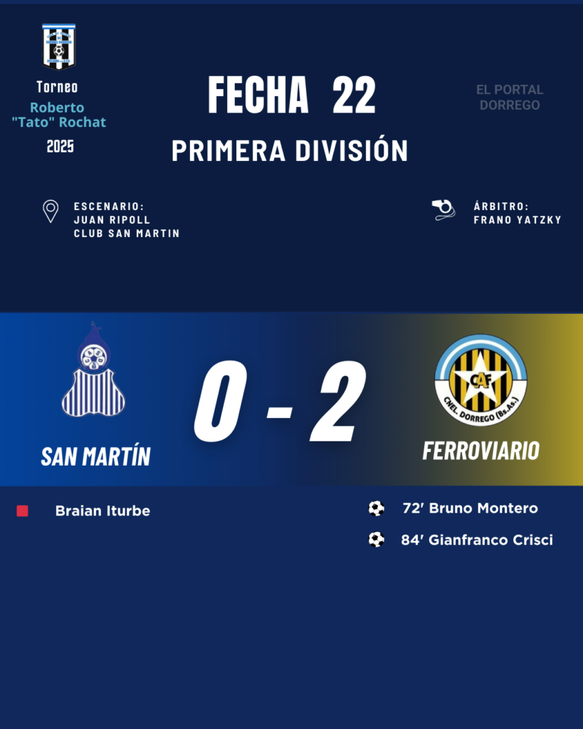 | San Martín : ( 0 ) Ferroviario : ( 2 ) : Lautaro Larsen ( P ) – un jugador de San Martín en contra |