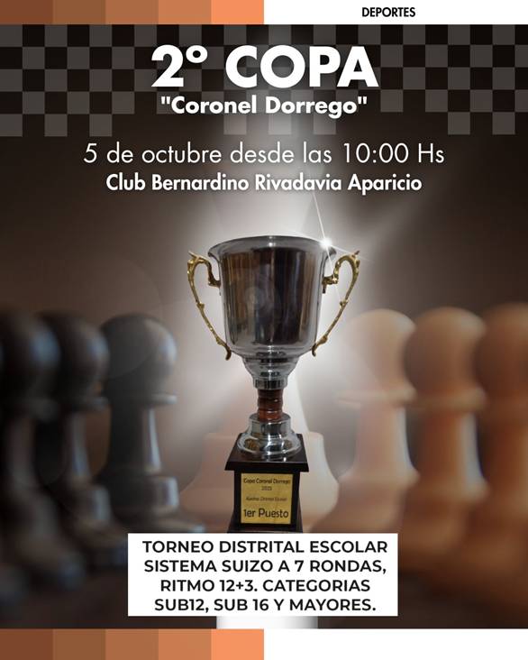 Con más de 60 inscriptos se llevará a cabo el próximo domingo la segunda edición de la Copa Coronel Dorrego de Ajedrez en las instalaciones del club Bernardino Rivadavia de Aparicio.
