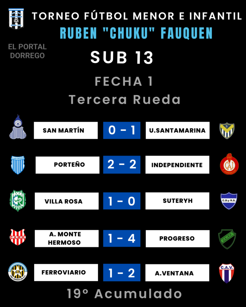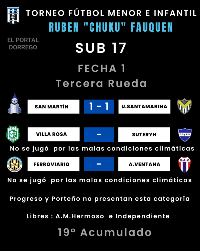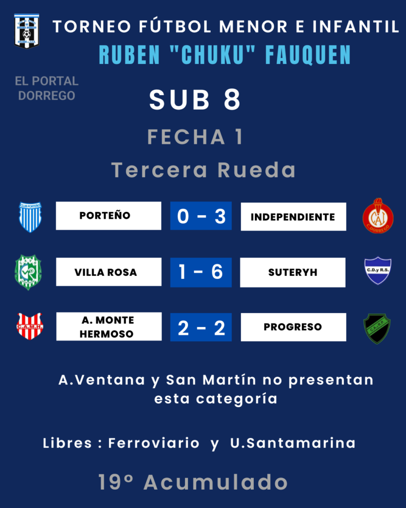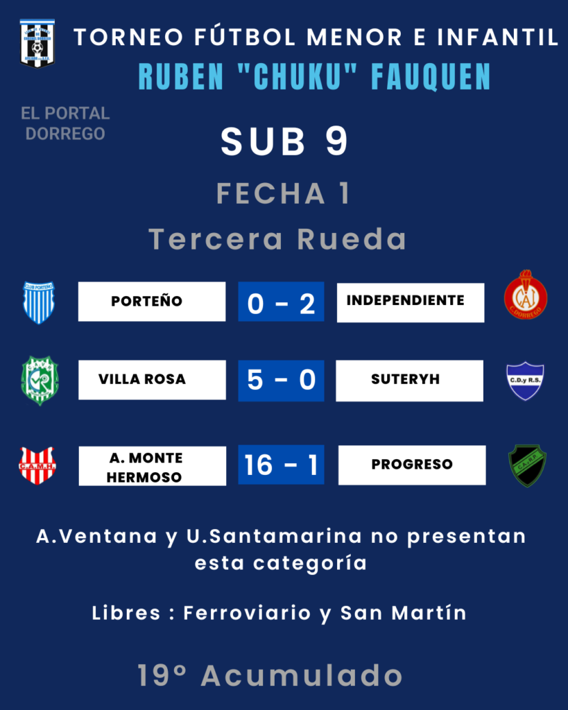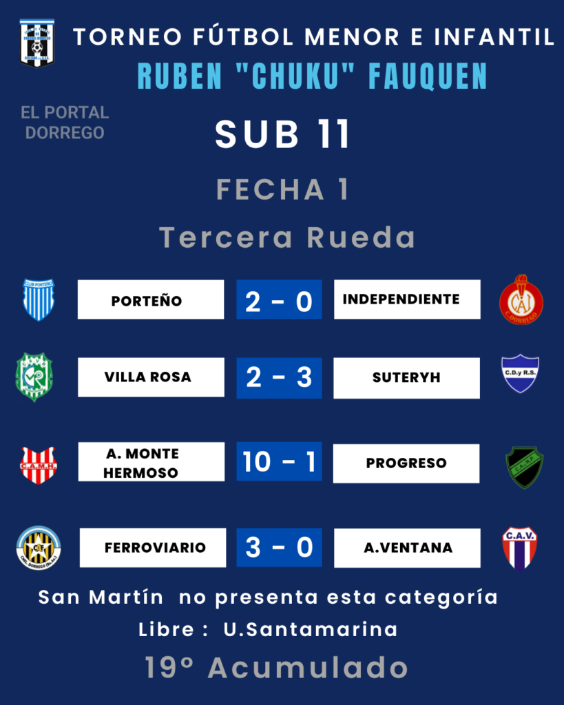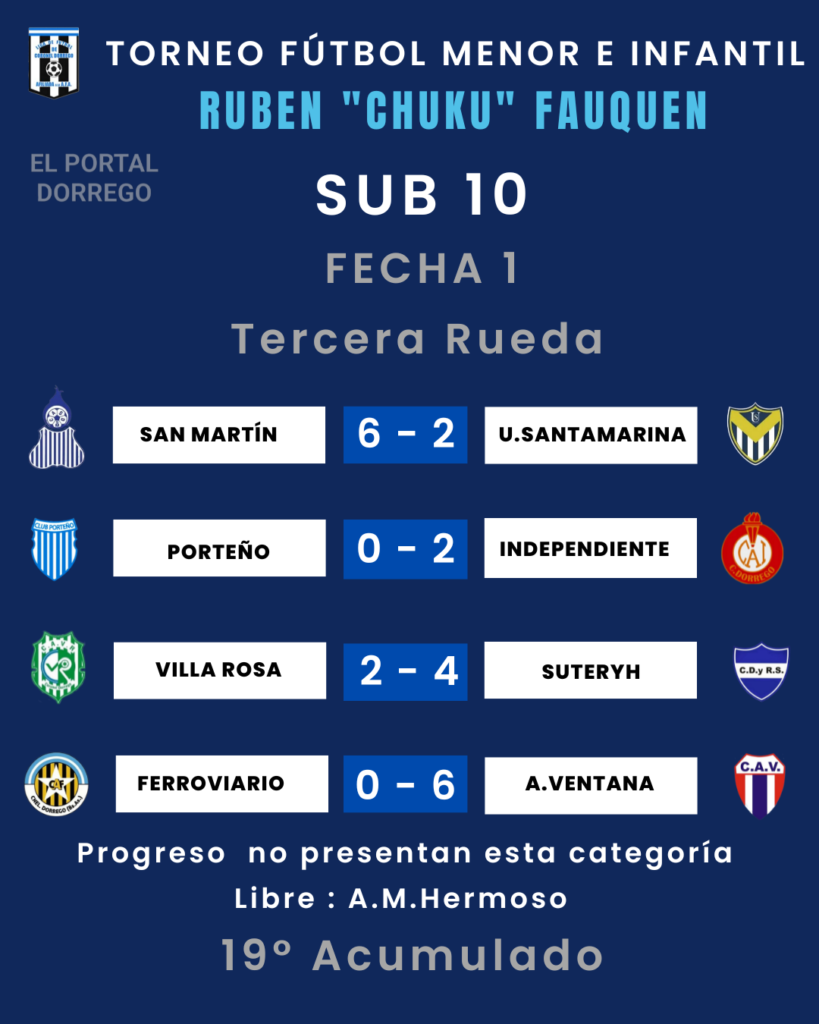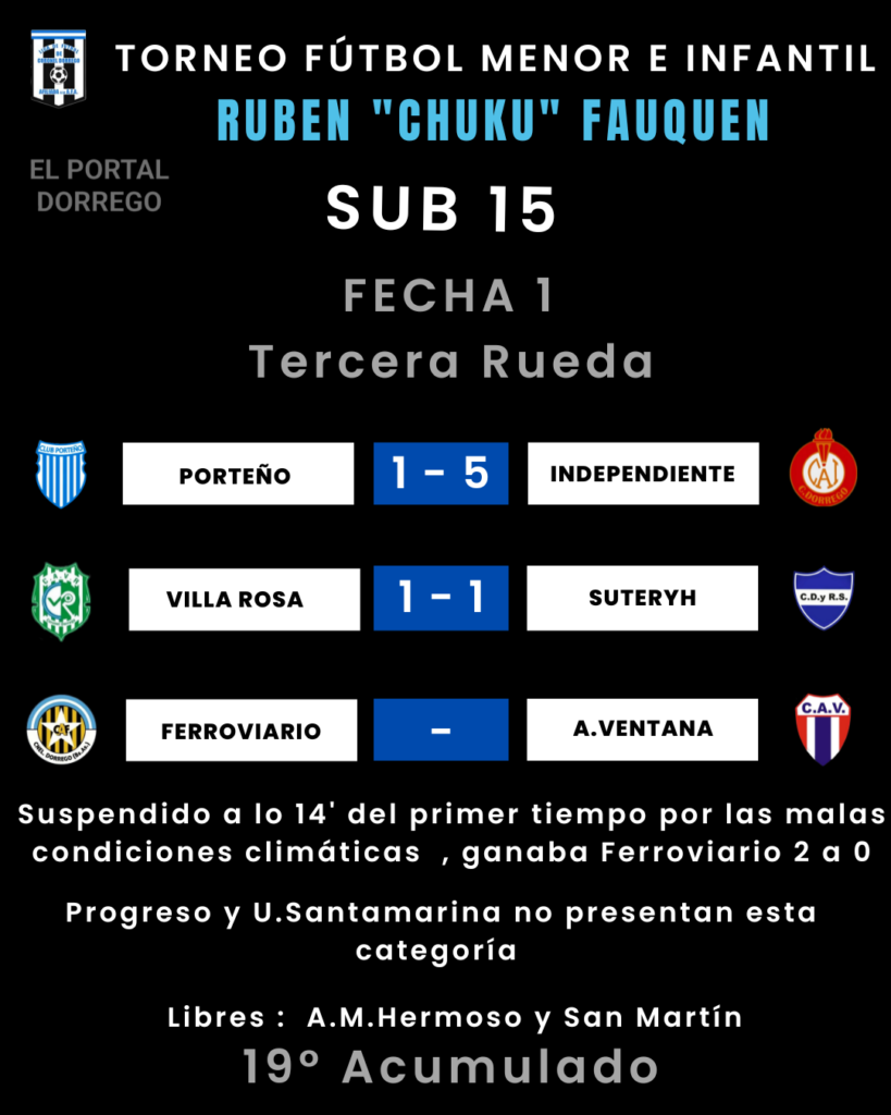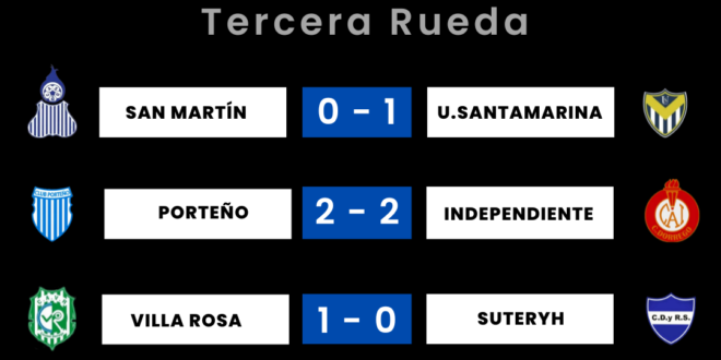 | Independiente 3 Pts Villa Rosa 1 Pt Suteryh 1 Pt Porteño 0 Pt A.M.Hermoso 0 Pt San Martín 0 Pt. Ferroviario – A.Ventana – Ferroviario y A.Ventana, tienen un partido suspendido a los 14 ‘ del primer tiempo por las malas condiciones climáticas , gana Ferroviario 2 a 0 |