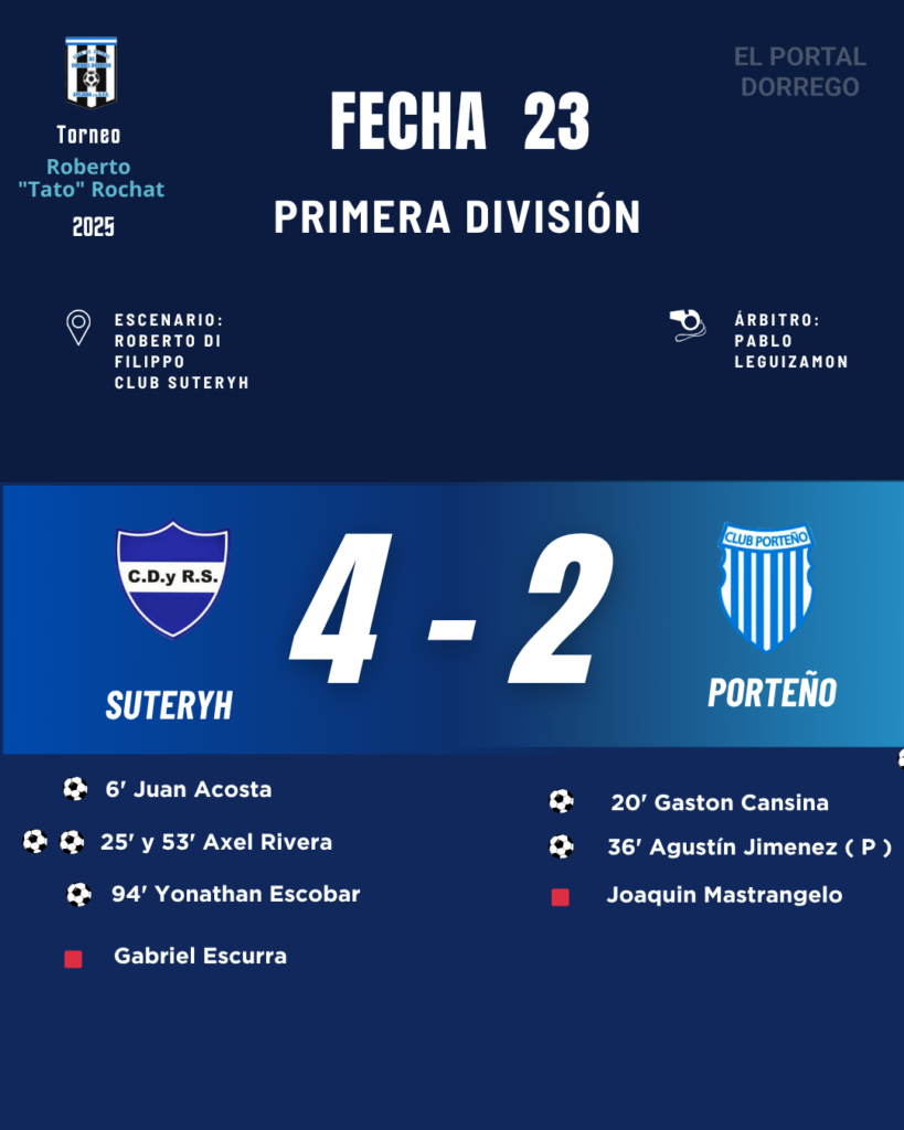 | Suteryh : ( 1 ) : Alex Plattner Porteño : ( 3 ) : Gianfranco Navarro – Joel Esmoli – Ivan Correa El jugador de Porteño Gaston Retamar , malogró un penal Expulsados : Braian Gomez ( Sut. ) – D.T. de Suteryh Andres Reyes y demás integrantes del cuerpo técnico |