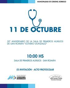 La Municipalidad anunció para el venidero sábado 11 el Acto por el Quincuagésimo Aniversario de la Sala de Primeros Auxilios «Lotario González» de San Román. Será desde las 10 en instalaciones de la institución.