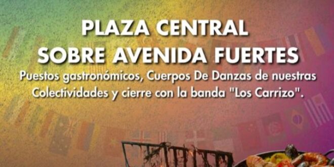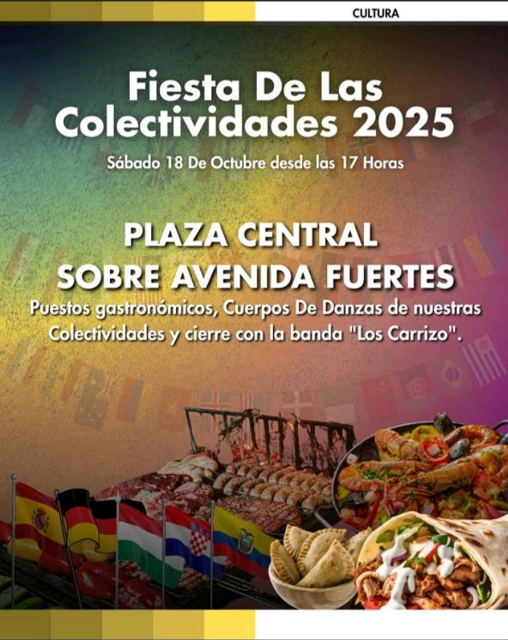 La Dirección de Cultura de la comuna anunció para este sábado 18 desde las 17 la Fiesta de las Colectividades 2025. Será en la Plaza Central sobre Avenida Fuertes. Habrá Puestos Gastronómicos, Cuerpos de Danzas de nuestras Colectividades y el cierre estará a cargo de la banda «Los Carrizo».