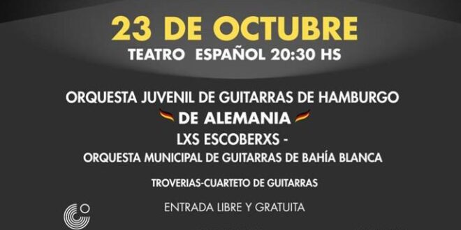 Cultura anunció para este jueves 23 en el Teatro Español desde las 20:30 la presentación de la Orquesta Juvenil de Guitarras de Hamburgo, Alemania. Además actuará la Orquesta Municipal de Guitarras de Bahía Blanca, Lxs Escoberxs y Troverías, cuarteto de Guitarras. La entrada será libre y gratuita.