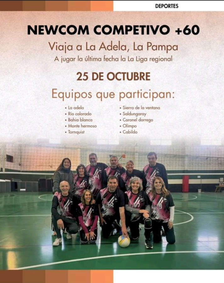 El equipo de Newcom +60 participará este 25 de octubre de la última fecha de la Liga Regional, que se disputará en La Adela, provincia de La Pampa. El torneo reunirá a delegaciones de La Adela, Río Colorado, Bahía Blanca, Monte Hermoso, Tornquist, Sierra de la Ventana, Saldungaray, Olimpo, Cabildo y Coronel Dorrego.