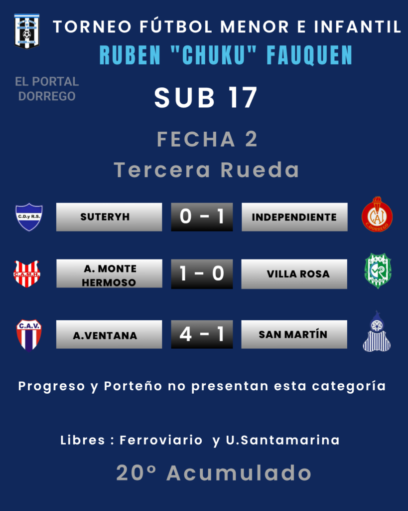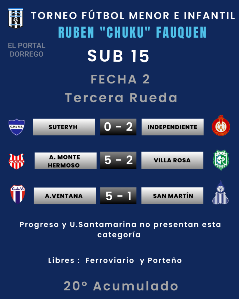 Con los encuentros entre Suteryh e Independiente en sub 15 y sub 17 , se completó la fecha 2 de la tercera rueda y 20 del Acumulado del torneo de fútbol menor e infantil Ruben «Chuku’ Fauquen