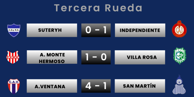 | A.Ventana 3 Pts A.M. Hermoso 3 Pts. Independiente 3 Pts San Martín 1 Pt U.Santamarina. 1 Pt Villa Rosa 0 Pt Suteryh 0 Pt Ferroviario 0 Pt Villa Rosa vs Suteryh y Ferroviario vs A.Ventana , tienen sus partidos suspendidos , los mismos se jugarán este sábado |