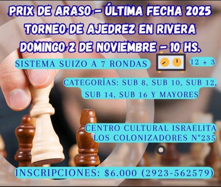 La Escuela Municipal de Ajedrez participará el venidero domingo 2 en Rivera de la gran final del circuito del Prix de Araso 2025. Jugarán: Mayores: Javier Claverie y Emmanuel Piñero; Sub 16: Lautaro Gigena,; Sub 14: Octavio Iriarte y Mora Sarti; Sub 12: Carmelo Moller y Tomás Irazusta y Sub 8: Santiago Claverie. La Escuela local está a cargo de Emmanuel Piñero.
