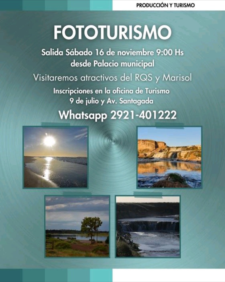 La Oficina de Turismo de la Municipalidad informó que se encuentran abiertas las inscripciones para participar de una jornada de Fototurismo. Se visitarán atractivos del Río Quequén Salado y Balneario Marisol. Los interesados se pueden inscribir en la Oficina de Turismo de 7 a 14, al whatsapp al 02921401222.