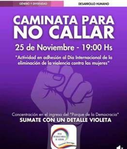 El área de Género y Diversidad, dependiente de la Dirección de Desarrollo Humano de la Municipalidad de Coronel Dorrego, invitó a participar de la actividad “Caminata para no callar”, organizada en el marco del Día Internacional de la Eliminación de la Violencia contra las Mujeres, que se conmemora cada 25 de noviembre.