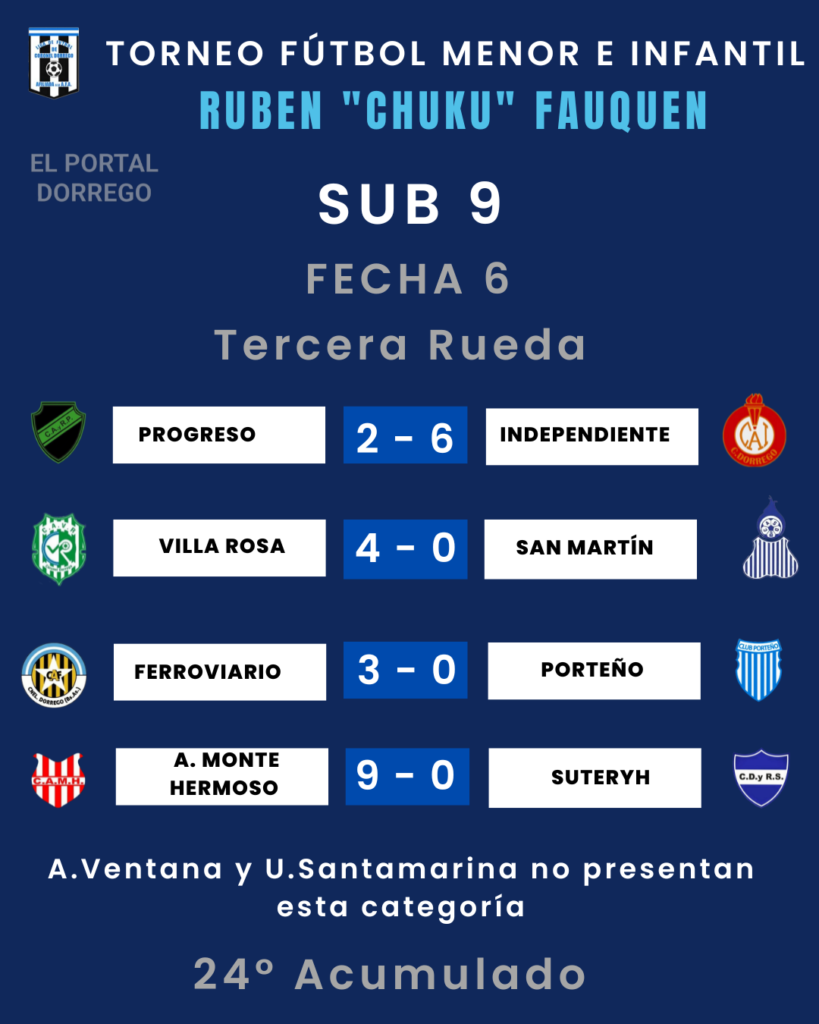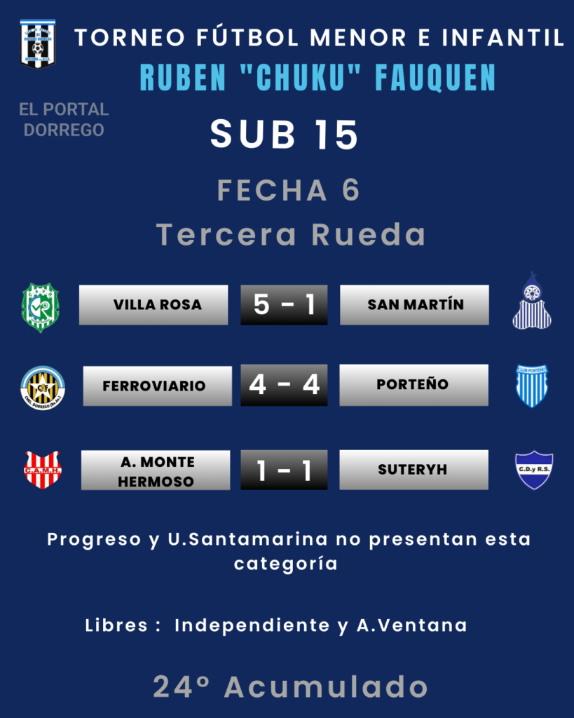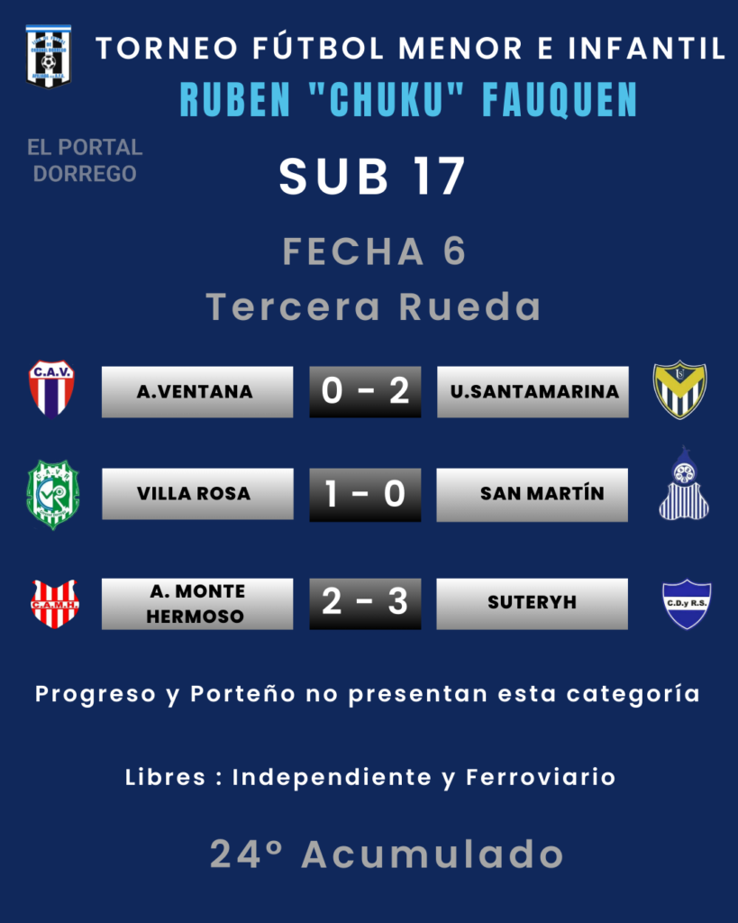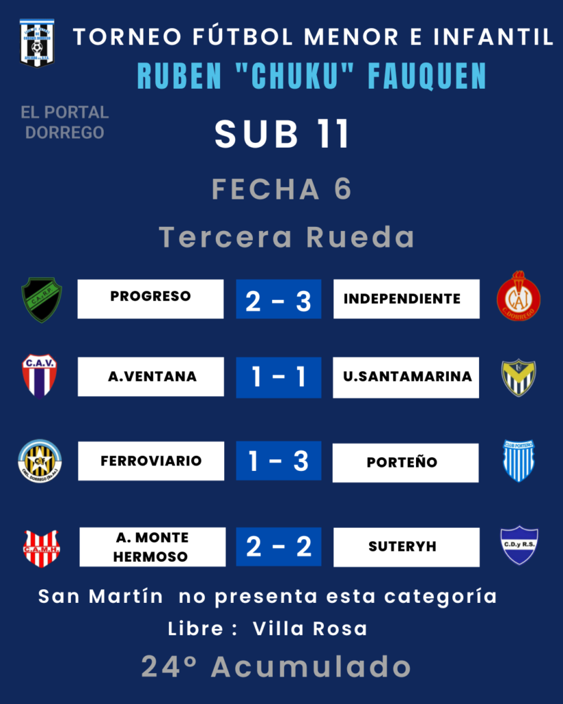 | Villa Rosa vs A.Ventana Unión Santamarina vs Progreso Independiente vs A.M.Hermoso Suteryh vs Ferroviario Porteño vs San Martín |