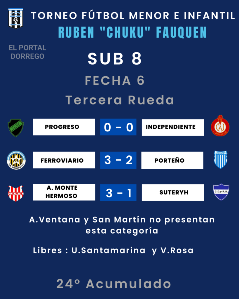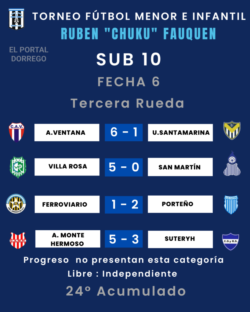 | Suteryh 10 Pts U.Santamarina. 10 Pts Villa Rosa 8 Pts Independiente 7 Pts A.M. Hermoso 7 Pts. San Martín 5 Pts Ferroviario 3 Pts A.Ventana 3 Pts |