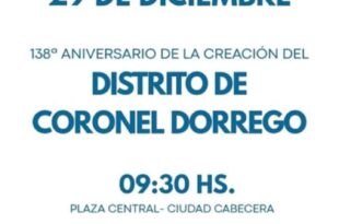 La Municipalidad anunció para el lunes 29 a las 9:30 en la Plaza Central el Acto por el Centésimo Trigésimo Octavo Aniversario de la Creación del Distrito de Coronel Dorrego. Desde Protocolo de la comuna se invitó a concurrir con Banderas de Ceremonia. Info : Prensa municipalidad de C.Dorrego