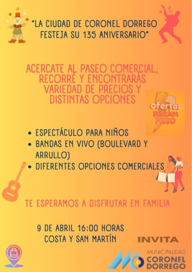 La Municipalidad anunció para este miércoles 9 como parte de los festejos del Aniversario de la Ciudad, en Costa y San Martín, espectáculos para niños y también las actuaciones de las bandas Boulevard y Arrullo.
