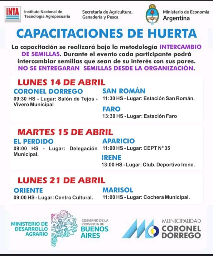 Producción de la comuna informó que mediante el INTA y el Ministerio de Desarrollo Agrario Bonaerense, se realizarán capacitaciones de huerta; será bajo la metodología intercambio de semillas. Durante el evento cada participante podrá intercambiar semillas que sean de su interés con sus pares. No se entregarán semillas desde la organización.