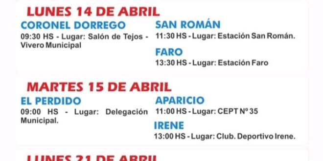 El lunes 14 a las 9:30 será en el predio de Tejo en el Vivero Municipal; a las 11:30 en la Estación San Román y a las 13:30 en la Estación Faro. El martes 15 a las 9 en la Delegación de el Perdido, a las 11 en el CEPT de Aparicio, el lunes 21 a las 9 en el Centro Cultural de Oriente y a las 11 en la cochera municipal en Marisol.