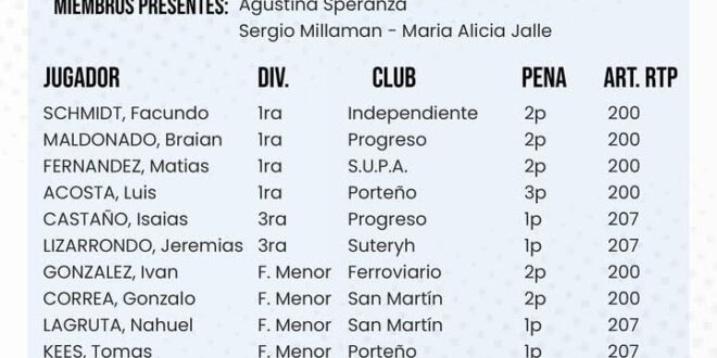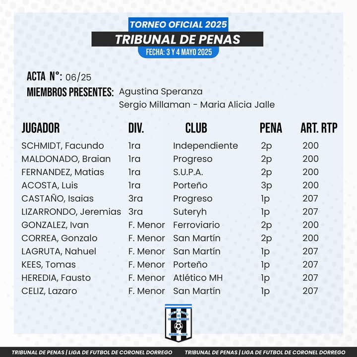 Fútbol local : Dictamen del Tribunal de Penas El portaldorrego mayo 6, 2025 DEPORTES Comentarios desactivados en Fútbol local : Dictamen del Tribunal de Penas COMPARTIR tweetRelated Articles Fútbol menor : el domingo se juegan las finales de la liguilla1 día ago Se jugó la final sub 15 Femenino y las semifinales de la liguilla fútbol menor2 días ago Programación final sub 15 Femenino y semifinales liguilla fútbol menor5 días agoCOMPARTA NUESTRAS NOTICIASInfo : facebook Liga de fútbol Coronel Dorrego COMPARTIR tweet