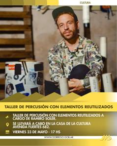 Cultura anunció un Taller de Percusión con elementos reutilizados. Será este viernes 23 a las 17 en la Casa de la Cultura. Estará a cargo de Ramiro Soler. Info e imagen : Prensa municipalidad de C.Dorrego