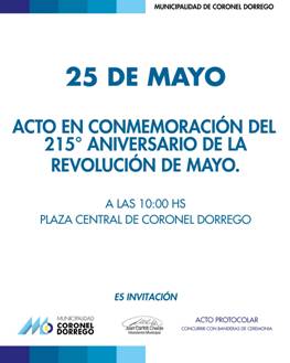 La Municipalidad anunció el Acto en conmemoración del 215º Aniversario de la Revolución de Mayo. Será este domingo 25 a las 10 en la Plaza Central. Desde Protocolo se invitó a concurrir con banderas de ceremonia.