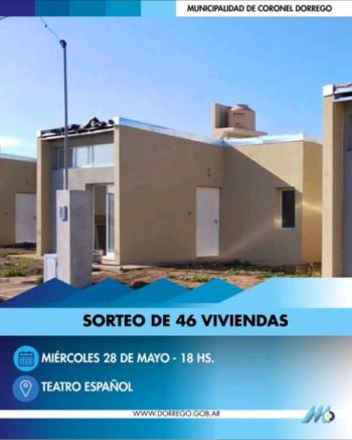 La Municipalidad informa que este miércoles 28 de mayo en el Teatro Español a las 18, se realizará el Sorteo de las 46 Viviendas del Programa Bonaerense II.