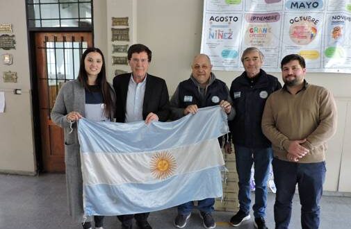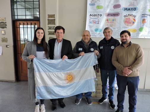 El Intendente Juan Chalde acompañado del presidente del Concejo Deliberante, Casiano Gutiérrez, participó este martes del momento en que integrantes de Veteranos de Guerra Continentales por Malvinas entregaron a autoridades de la Escuela Nº:1 la bandera que ondeó durante 74 días, que es el lapso de duración de la Guerra por Malvinas, en el mástil ubicado en el monumento a Malvinas en el ingreso a Coronel Dorrego.